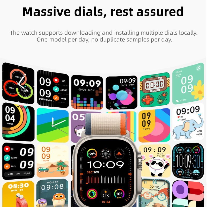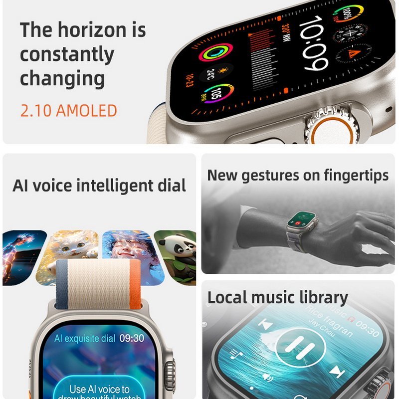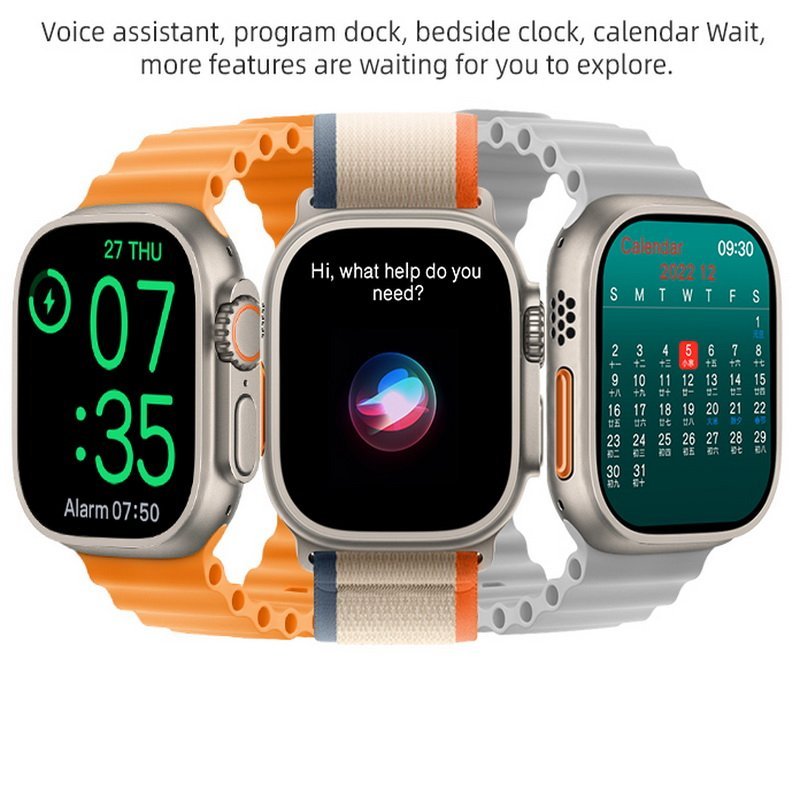 Feature | 1. Zinc alloy Light Grey body 2. Watch Ultra 2 Display: 2.1 Amoled 420*486 3. BT 5.0,compatible with iOS 11.0 and Android OS 4,BT calling and TWS connect 5, Always on display 6.Notification push and information sync 7. Messages Notification from Phone 8. Health detection: Real-time heart rate detection, Blood pressure detection, blood oxygen detection, sleep analysis, water clock, sedentary reminder, female physiological cycle 9.Sports track: Walking, running, climbing, riding, swimming, yoga, basketball and etc. 10. Other functions: find phone, music control, camera control, stopwatch, multi languages and etc. 11. Big battery 380mAh, Normal use: 5-7days; Standby: 12days 12.Interchangeable watchband Specially Ocean Straps For Watch Ultra 2 13. Watch Ultra 2 is Waterproof IP67 Rated |