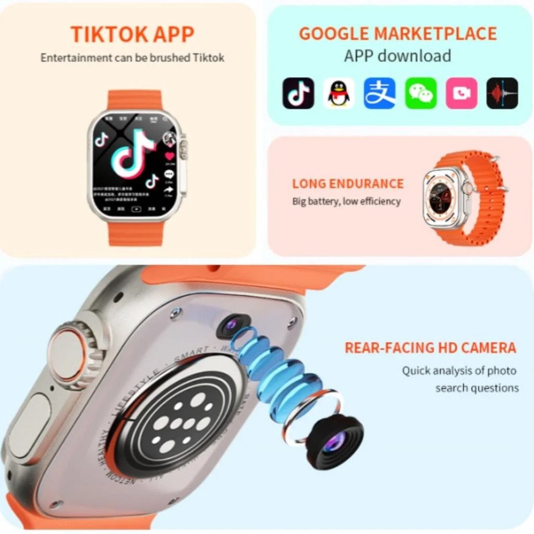 The S8 Ultra 2 5G Back Camera Android Smartwatch brings smartphone-level performance to your wrist. Its 2.08-inch bezel-less IPS display offers bright visuals and smooth touch navigation.